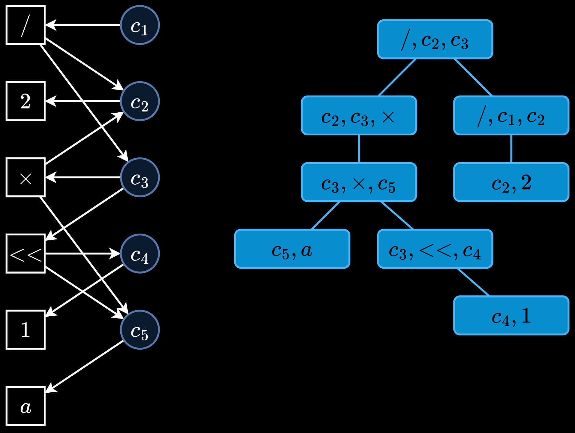 add: takes an e-node, (insert an e-class if not exist)merge: unions two e-class ids;find: canonicalizes e-class id with union-find;ematch: performs e-matching for finding patterns in the e-graph.for e-class c in e-graph E: