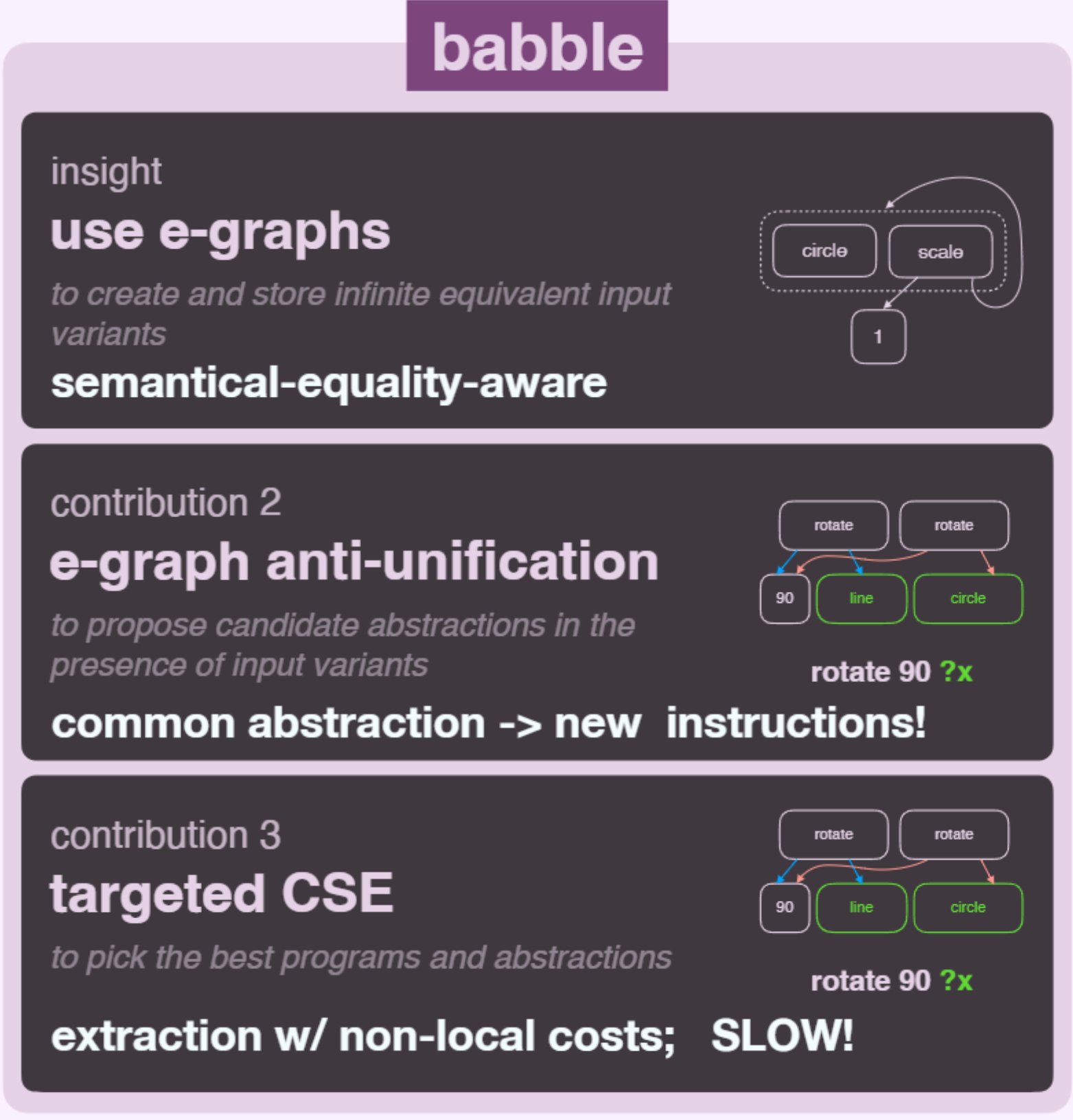 ### What we need? > instruction finding from domain of applications - program rewrites: [eggcc](https://github.com/egraphs-good/eggcc)? [jlm](https://github.com/phate/jlm)? what else? - tractable EqSat: - pruning ([Isaria](https://dl.acm.org/doi/10.1145/3617232.3624873))? guiding ([egg-sketch](https://dl.acm.org/doi/10.1145/3632900))? - learn instruction: - what to learn? acceptable instr.? cost model? - how to learn? [Babble](https://dl.acm.org/doi/10.1145/3571207)? - more efficient extraction?
