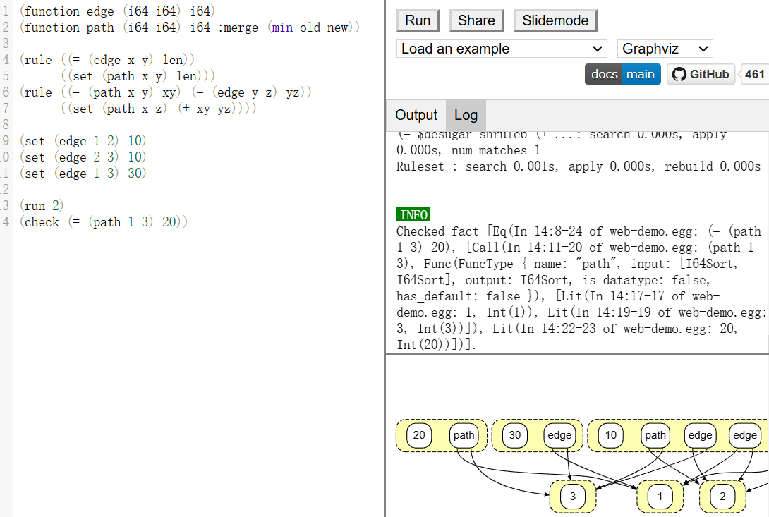 add: takes an e-node, (insert an e-class if not exist)merge: unions two e-class ids;find: canonicalizes e-class id with union-find;ematch: performs e-matching for finding patterns in the e-graph.for e-class c in e-graph E: